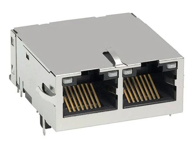 0826-1X2T-23-F गिगाबिट मैगजैक डुअल-पोर्ट RJ45 कनेक्टर एकीकृत मैग्नेटिक्स, 12 कोर, EMI शील्डिंग, 1500Vrms आइसोलेशन, और 10/100/1000Base-T ईथरनेट नेटवर्किंग उपकरण के लिए LED इंडिकेटर के साथ।